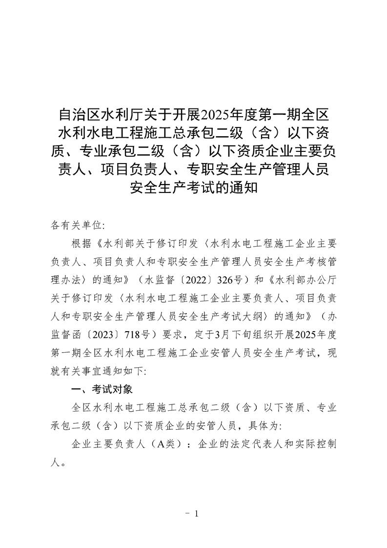 正规博彩平台关于开展2025年度第一期全区水利水电工程施工总承包二级(含)以下资质、专业承包二级(含)以下资质企业主要负责人、项目负责人、专职安全生产管理人员安全生产考试的通知